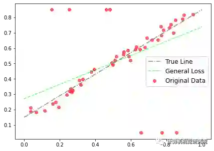 的一般形式和固定α值,可以得到拟合线。原始数据、真直线(生成数据点时使用的具有相同斜率和偏差的线,排除异常值)和拟合线如下图4所示: