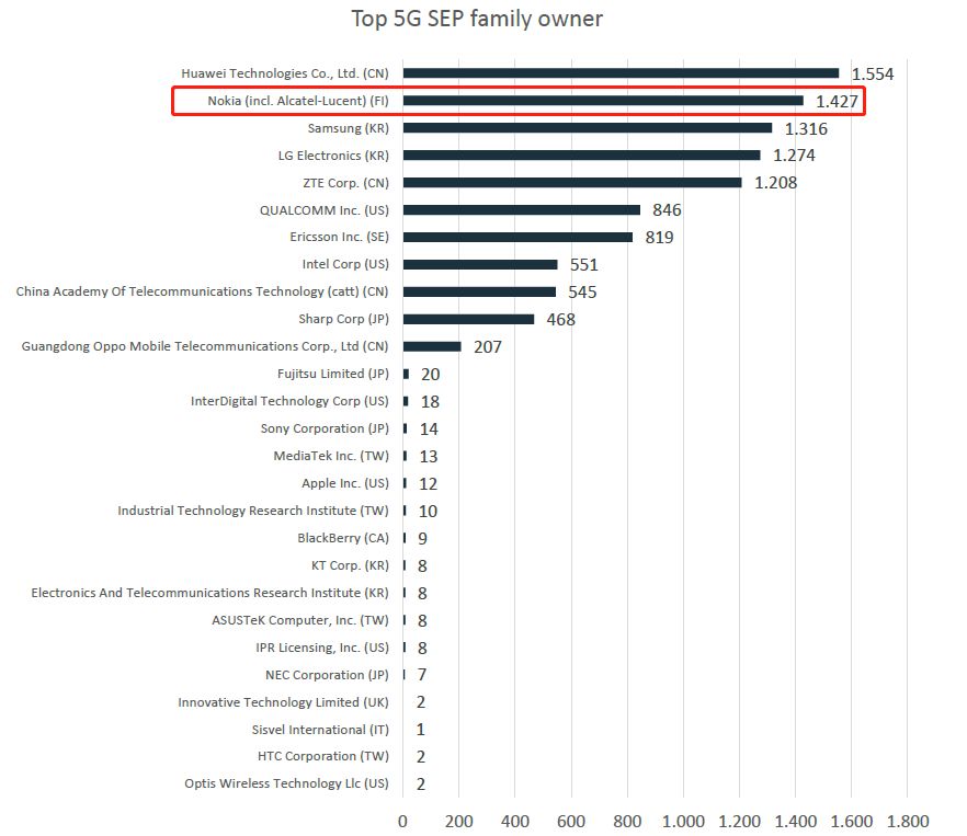 从更为关键的已申报SEP的顶级专利所有者一项可以看出,随着美国和韩国相继商用5G,与去年12月底的那份报告相比,各家厂商的SEP数量和排位发生不小变化。中国企业的排位持续上升,华为1554项、中兴1208项、大唐545项分列第一、第五、第九位,OPPO拥有207项,跌出前十,位列第十一。诺基亚则彻底翻身,从第十名一跃至第二名,拥有的SEP也从299项增长为1427。