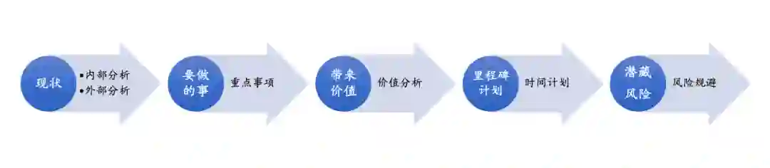 总结下来,产品规划就是因为一个原因(现状)、我们需要做什么事情、做这个事情能给公司带来什么价值、具体该怎么落地、可能遇到的问题或风险是什么,最后就是需要的资源支持。