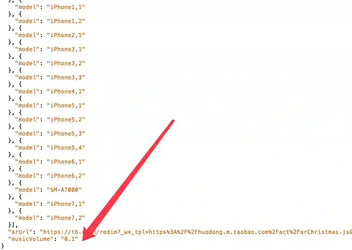 我看到了musicVolume这个字段,我猜测这个应该就是控制首页背景音乐的的变量。我们再看上面的这些设备名称,他们在blackList字段里面,黑名单?iPhone7,2就是第7代iPhone,也就是iPhone6 plus。我再看arUrl这个字段,AR?我断定这个就是首页右边的那个悬浮的圣诞树。因为那个圣诞树我点击后会跳转到一个AR技术的页面活动。我使用iPhone7和iPhone5s分别去打开淘宝客户端,果然在黑名单里的设备是看不到这颗圣诞树的。也就是黑名单里的设备是不支持AR技术的。具体可以看下苹果关于ARKit的介绍,必须是A9处理器以上哟! 传送门->点我