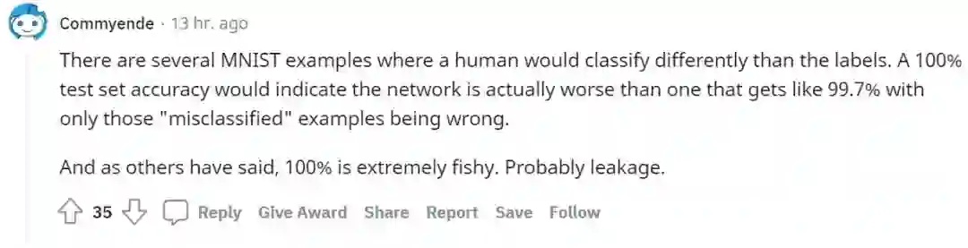 在 reddit 上,有网友表示:「MNIST 数据集中有几个图人类的分类方式与标签不同。100% 的测试集准确率表明网络实际上比那些错误率的 99.7% 的网络还要差。所以正如其他人所说,100% 准确率的数字非常可疑。」