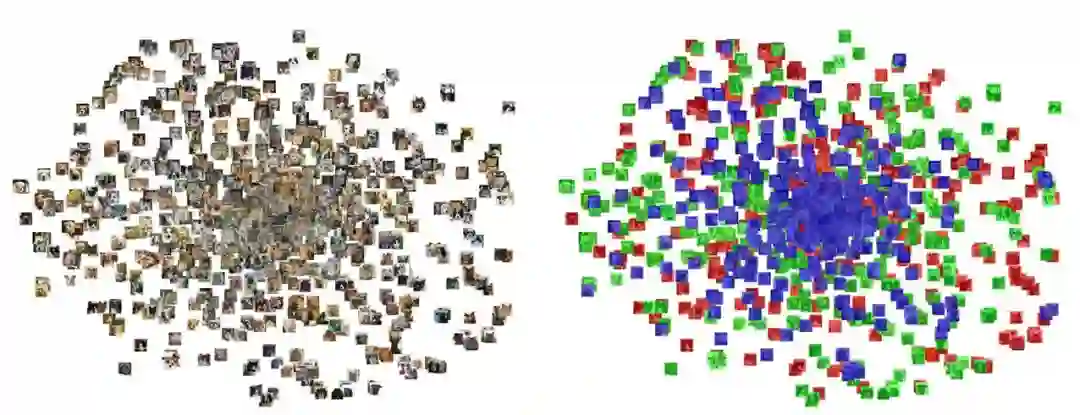 )图 1:在 AFHQ 的 300 张图像上带有签名的 PCA 自适应 t-SNE,类别:猫(红色)、狗(绿色)和野生(蓝色)。