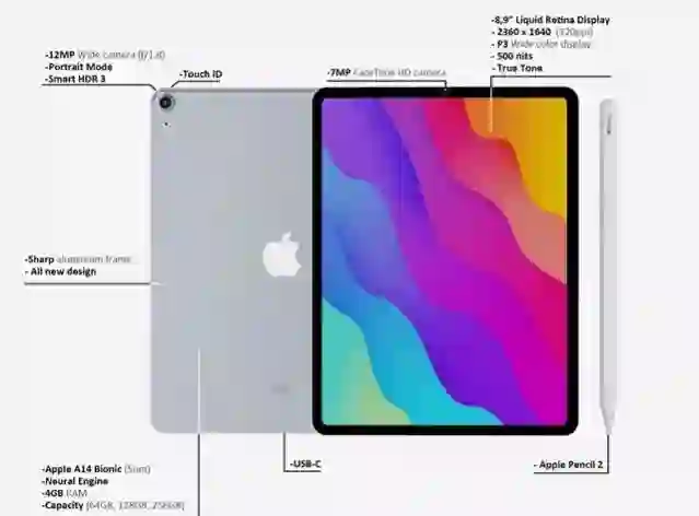2. iPad mini6:此次更新的iPad mini将会升级到一块8.3/8.4英寸全面屏,移除了正面经典的Touch ID指纹,改为侧边指纹,搭载A14处理器,支持5G支持二代磁吸Apple Pencil