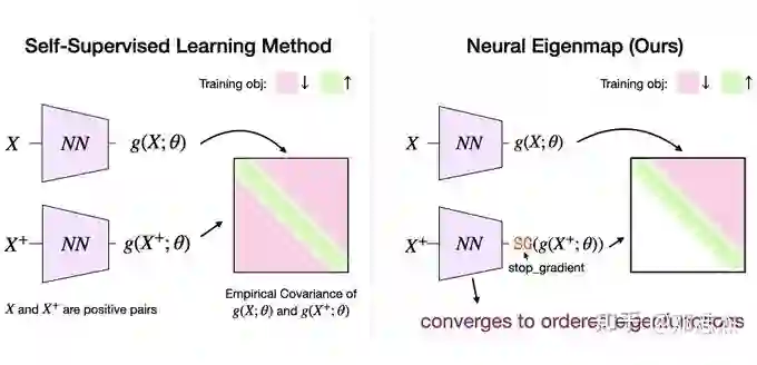 基于特定的 breaking-symmetry 手段(stop gradient 和仅优化上三角部分),Neural Eigenmaps 中神经网络的输出是结构化的,会逐元素收敛到核的 k 个主特征函数。