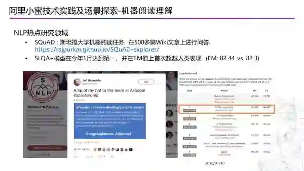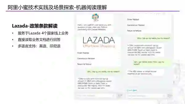 第三个场景用在海外的企业,Lazada-政策条款解读,需要解决的是如何让机器阅读运用到更多的语言,例如像印尼语这样的小语种,但印尼语在Lazada中是市场非常大的。