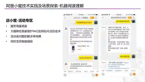 第四个场景是店小蜜中,我们推出了商家的活动专区功能,可以让商家直接以文本的方式来描述活动规则,机器自动阅读并回答用户问题。