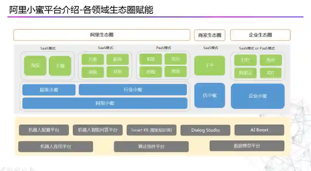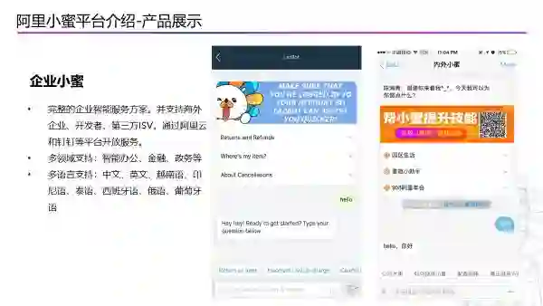 第三个是是通过企业小蜜支持整个企业的生态圈,现在国内和海外的企业,以及第三方ISV和开发者可以通过阿里云和钉钉等平台开放服务。所以在企业方面,我们不仅有电商小蜜,在政务、金融、办公等领域也有小蜜的支持,目前我们有了中文、英文、越南语、印尼语、泰语、西班牙语、俄语、葡萄牙语等多种语言的支持。第一个例子是东南亚最大的电商平台Lazada,第二个例子是为阿里巴巴内部为企业员工服务的内外小蜜,目前也有大量的钉钉企业用户采用了这种服务模式。