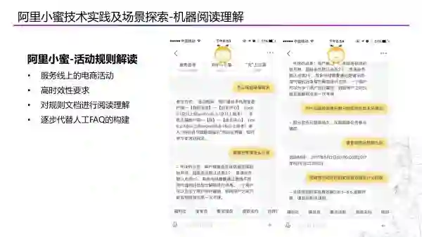 除了在学术领域取得一些成果之外,对于阿里小蜜来说更重要的是怎样通过机器阅读来真正解决真实场景中的问题。例如,在双十一等大促期间我们往往有大量的电商活动上线,而这些活动已经有一些规则文档,我们可以对这些文档进行阅读并回答用户关于双十一的活动问题,大大提升活动问答的上线效率。