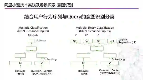 神经网络中会有两大输入,左边N会输入结构化数据,比如个人属性以及浏览操作历史纪录,右边V会输入一些非结构化数据,比如前几轮问的问题和序列,对于这些非结构化的数据我们会有句子编码器解析这些数据,当需要考虑到句子的语序关系的时候会使用CNN或者RNN网络结构;上层的话,会结合用户的Embedding和句子的Embedding去输出。但是工业真正的场景中,用户问题的问题个数是不固定的,所以会把最后一层Softmax 更改为多个二分类模型。