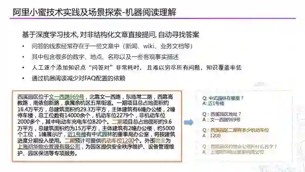 第二个场景是企业小蜜在支持外部的客户税务法规的解读。过去需要税务专业毕业的专业人员才能回答,现在我们可以通过机器阅读税务法规文档来回答问题。