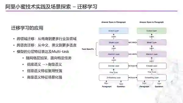 迁移学习对于企业小蜜有非常大的意义,因为需要从电商领域走向更多的行业,还有需要做跨语言的迁移学习。模型的迁移会做一个分层的表达,大部分的NLP模型都可以这样拆分,我们认为越是底层的层次越偏向于语言,他的复用性越高,越是上层,越偏向于具体的任务,复用性底。