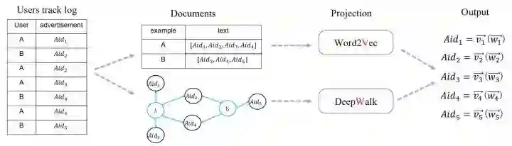 这里我们提取了用户的曝光记录,并将其转化为文本序列,然后使用word2vec算法对广告进行嵌入,就可以得到关于广告ID的embedding,或者商品ID的embedding。