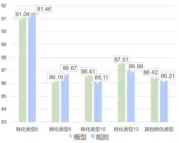 无论是模型还是规则,预测结果在不同的转化类型上得分差异都很大