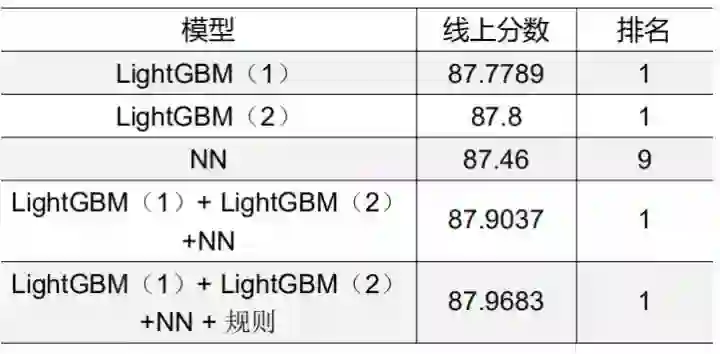 可以看出LightGBM单模既可以得到第一名的成绩,不过,为了追求更高的分数,我们团队也做了更多的尝试。