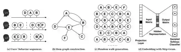 第二步:我们基于这些行为序列构建了物品关系图,可以看出,物品A,B之间的边产生的原因就是因为用户U1先后购买了物品A和物品B,所以产生了一条由A到B的有向边。如果后续产生了多条相同的有向边,则有向边的权重被加强。在将所有用户行为序列都转换成物品相关图中的边之后,全局的物品相关图就建立起来了。