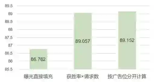 这里我们对比了三种计算方法,可以看出,直接用历史曝光填充效果最差。接下来就是用竞争胜率*请求数,分数会高很多,更近一步就是按广告位分开计算,达到最好的效果。这里是在验证集上进行的计算。