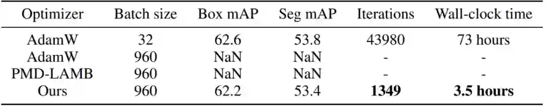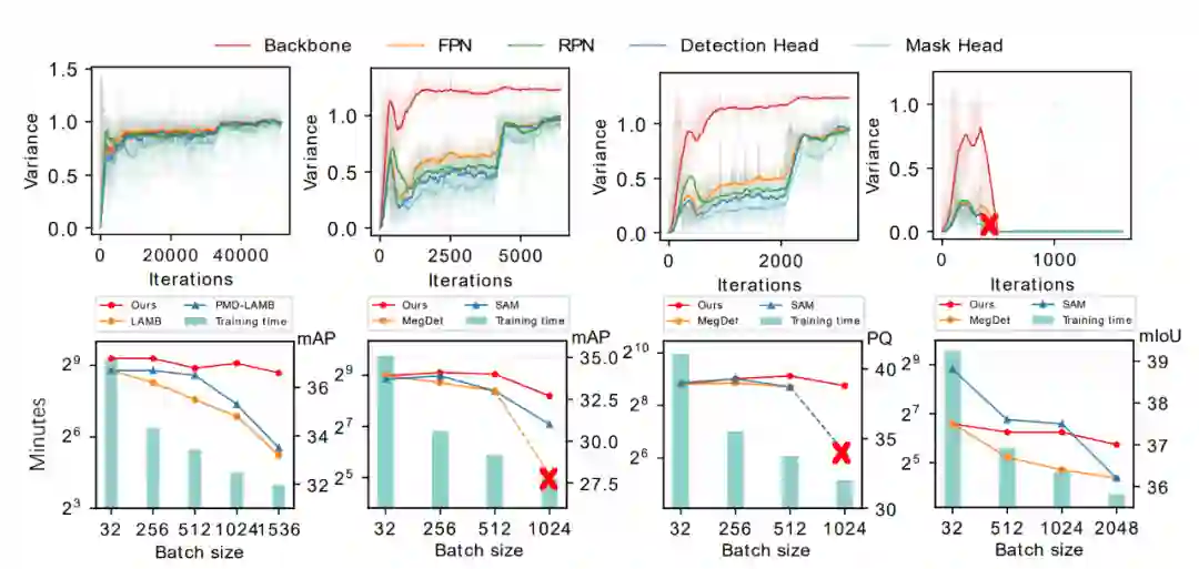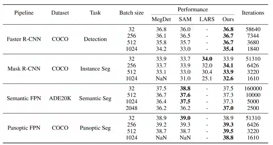 大批量训练是加速大型分布式系统中深度神经网络训练的关键。尤其是在如今的大模型时代,如果不采用大批量训练,一个网络的训练时间几乎是难以接受的。但是,大批量训练很难,因为它会产生泛化差距(generalization gap), 直接训练会导致其准确率降低。此前的大批量工作往往针对于图像分类以及一些自然语言处理的任务,但密集预测任务(包括检测分割等),同样在视觉中处于举足轻重的位置,此前的方法并不能在密集预测任务上有很好的表现,甚至结果比基准线更差,这导致我们难以快速训练一个目标检测器。