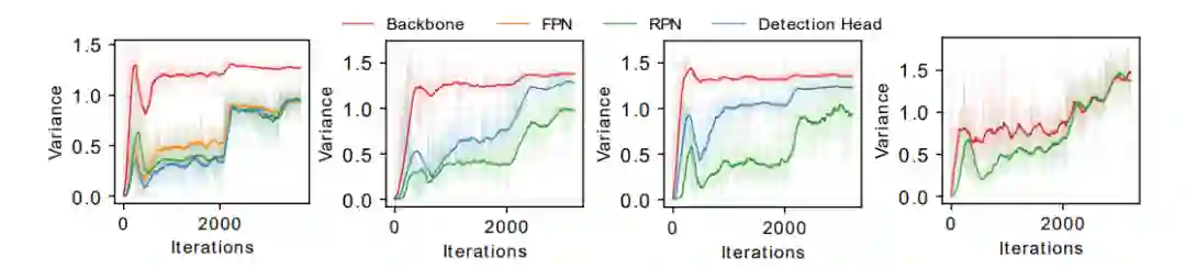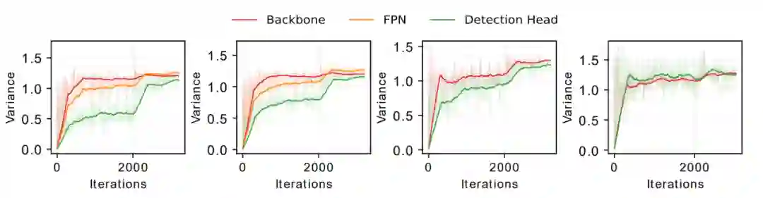 本研究认为,这一现象来自于:网络不同模块间的有效批量大小 (effective batch size) 是不同的。例如,RetinaNet 的头网络的输入是由特征金字塔的五层网络输出的,特征金字塔的 top-down 和 bottom-up pathways,以及像素维度的损失函数计算会导致头网络和骨干网络的等效批量大小不同,这一原理导致了梯度方差不匹配的现象。