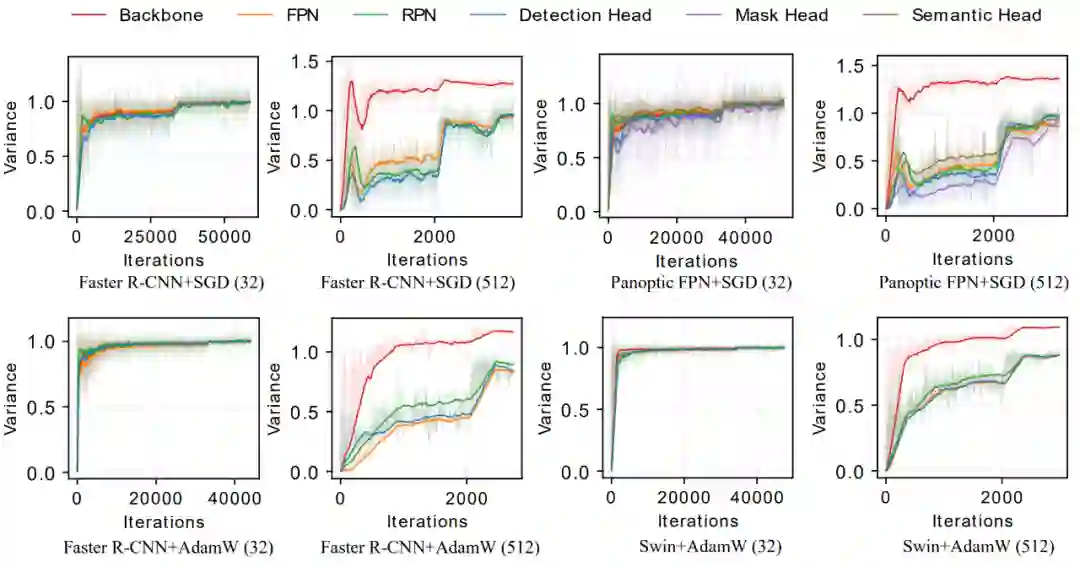 为了解决这个问题,研究人员进行了大量的实验。最后发现,相较于传统的分类网络,利用密集预测网络一个很重要的特征:密集预测网络往往是由多个组件组成的,以 Faster R-CNN 为例:它由四个部分组成,骨干网络 (Backbone),特征金字塔网络(FPN),区域生成网络(RPN) 和检测头网络(head),我们可以发现一个很有效的指标:密集预测网络不同组件的梯度方差,在训练批量很小时(例如 32),几乎是相同的,但当训练批量很大时(例如 512),它们呈现出很大的区别,如下图所示: