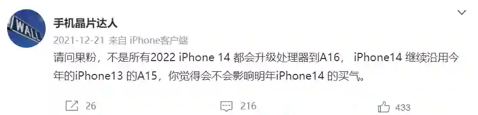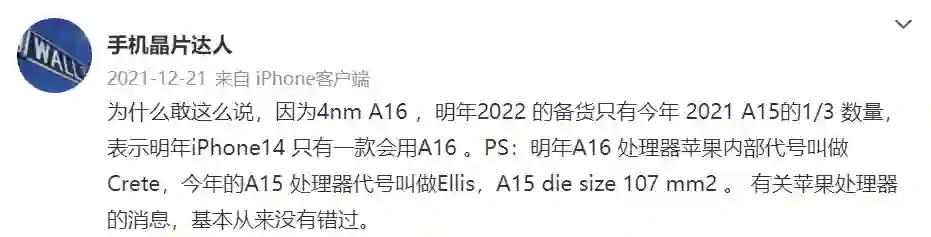 早在去年 12 月份,@手机晶片达人 便已经爆料称,不是所有的 2022 iPhone 14 都会升级到 A16 处理器,iPhone 14 将继续使用 A15 处理器。@手机晶片达人 还曾透露称,苹果 A16 处理器采用 4nm 工艺制程,代号为 Crete,且 2022 年的备货量仅有 2021 年 A15 备货量的三分之一。