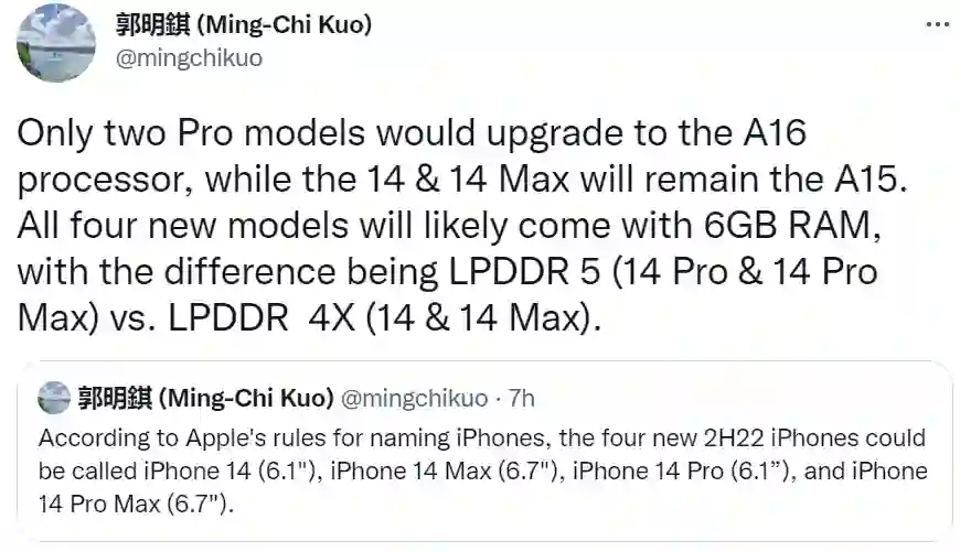 郭明錤还透露称,iPhone 14 Pro 和 iPhone 14 Pro Max 将会采用 6GB LPDDR5 内存,标准版的 iPhone 14 和 iPhone 14 Max 将会采用 6GB LPDDR4 内存。