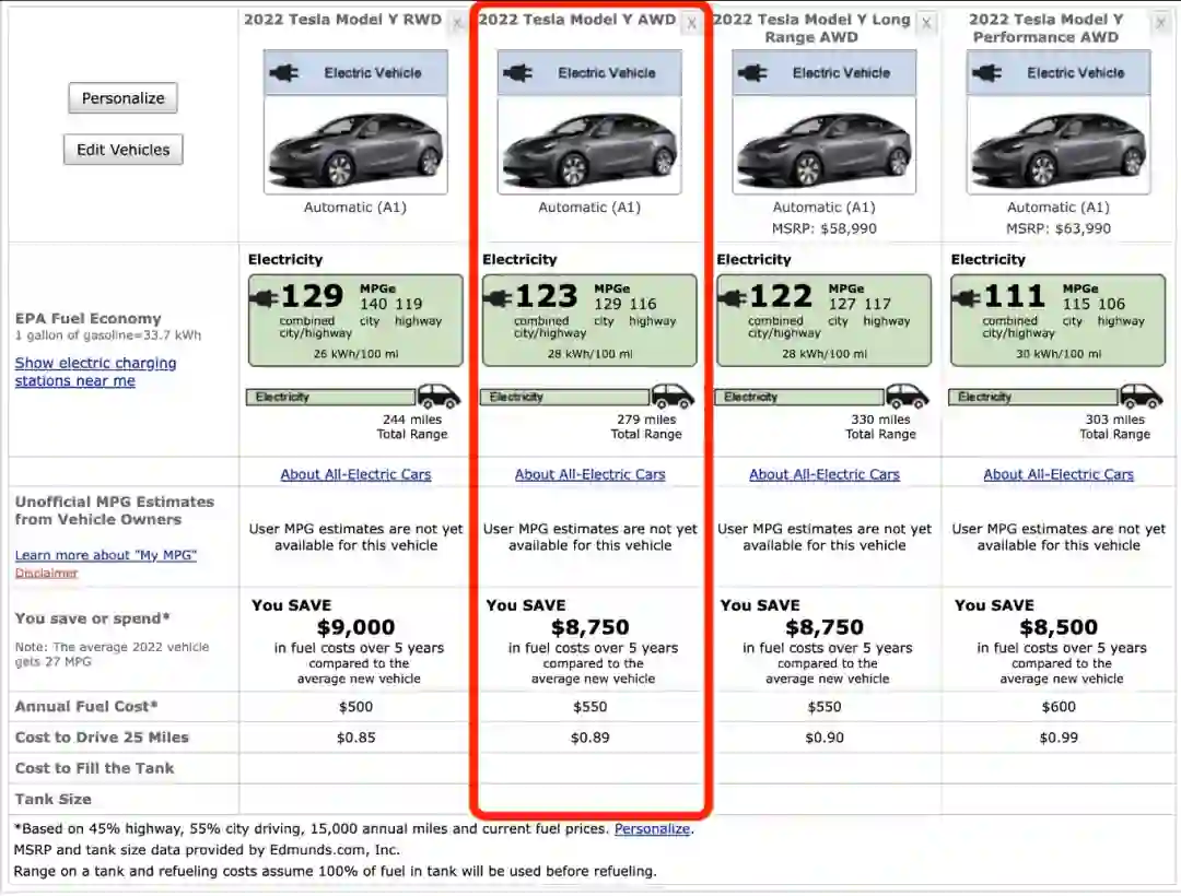 此外,根据特斯拉向 EPA 提交的一份新文件,特斯拉新 Model Y 在 EPA 网站上被称为“2022 Tesla Model Y AWD”,它 EPA 额定续航为 279 英里,远低于当前 330 英里(约 531.08 公里)续航里程的 Model Y 长续航 AWD 版。所以它应该是双电机版本的 Model Y,并将配备更小且效率更高的电池组。