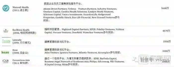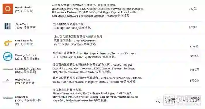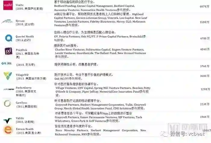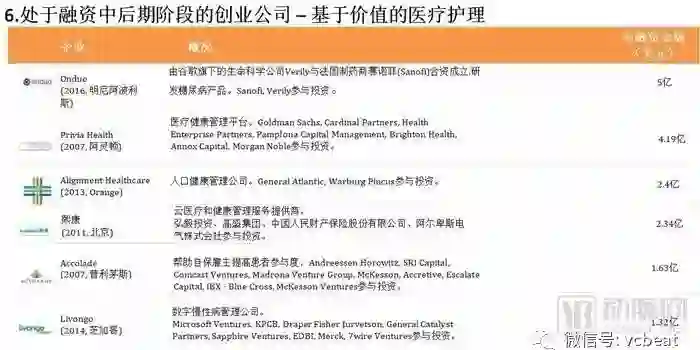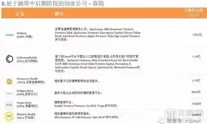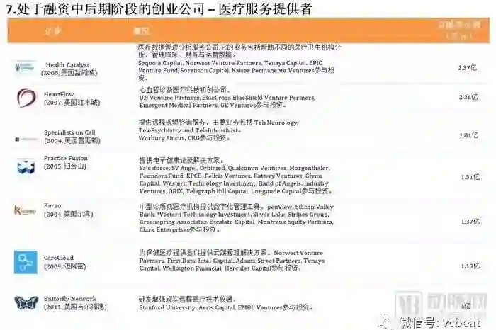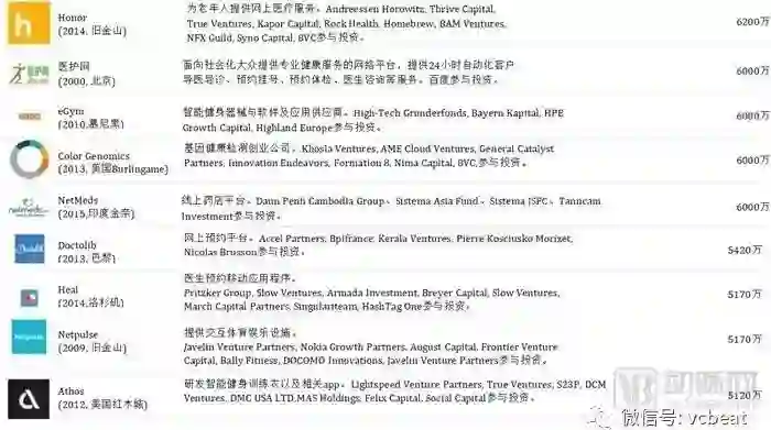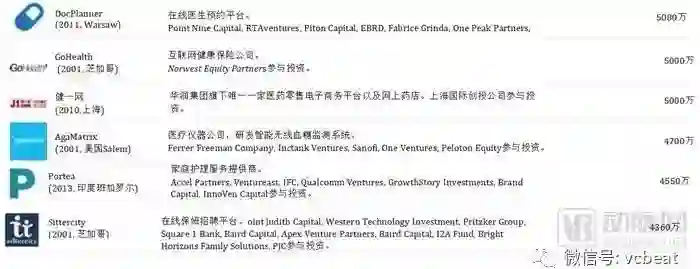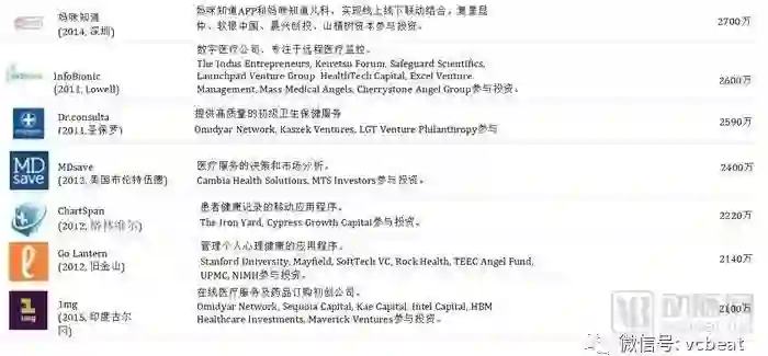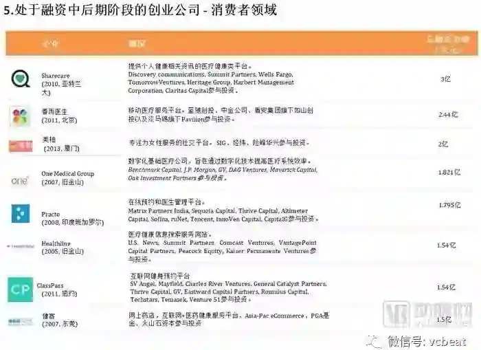中后期“预备队”中,中国公司包括:春雨医生、美柚、健客、七乐康、咕咚、丁香园、趣医、新氧、大姨妈、医护网、华米、妈咪知道、名医主刀、越美、360好药、寻医问药网等。