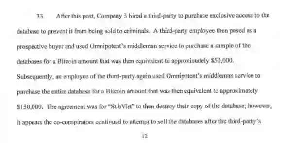 这个第三方的一名雇员假扮成潜在买家,利用RaidForums管理员的中间人服务,以5万美元的比特币购买了一份数据样本,文件中写道。这名员工随后以大约15万美元的价格购买了整个数据库,并附加了SubVirt会删除他们的数据副本的警告。删除的目的是限制信息进一步泄露的机会。