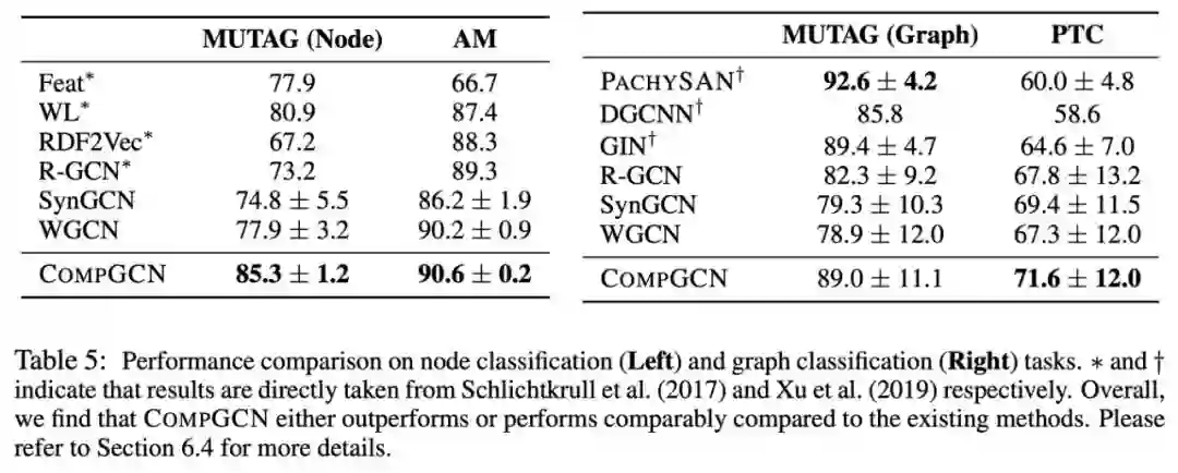 最后,作者也测试了 CompGCN 在节点分类/图分类上的效果,⻅ Table 5。在大部分情况下,CompGCN 都取得了最好的效果。