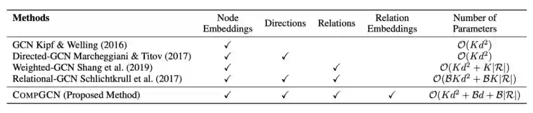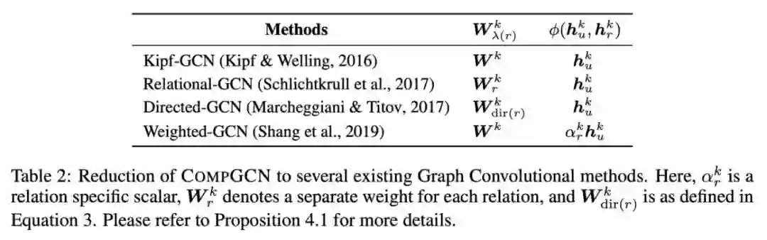 最后作者分析了 CompGCN 与之前的一些模型的异同。可以看出,之前的很多图神经网络实际都可以认为是 CompGCN 的特例。