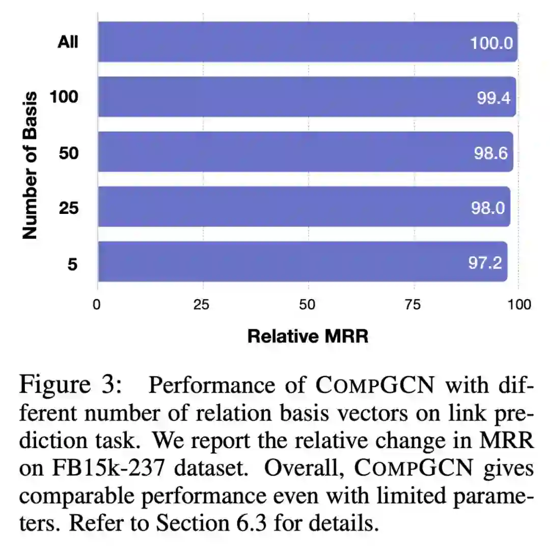 作者也测试了固定 5 个基向量的 CompGCN 与 R-GCN 的表现,⻅ Figure 4。可以看出,即使只有 5 个基向量,CompGCN 的效果也优于考虑所有关系的 R-GCN。