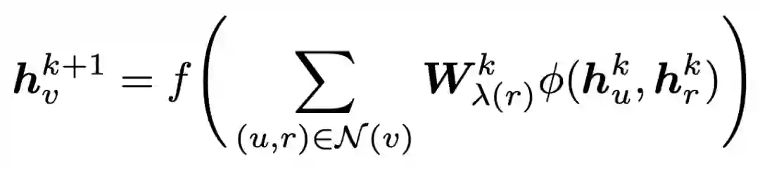 考虑邻居节点的表示和边类型的区别,新的聚合公式如下: