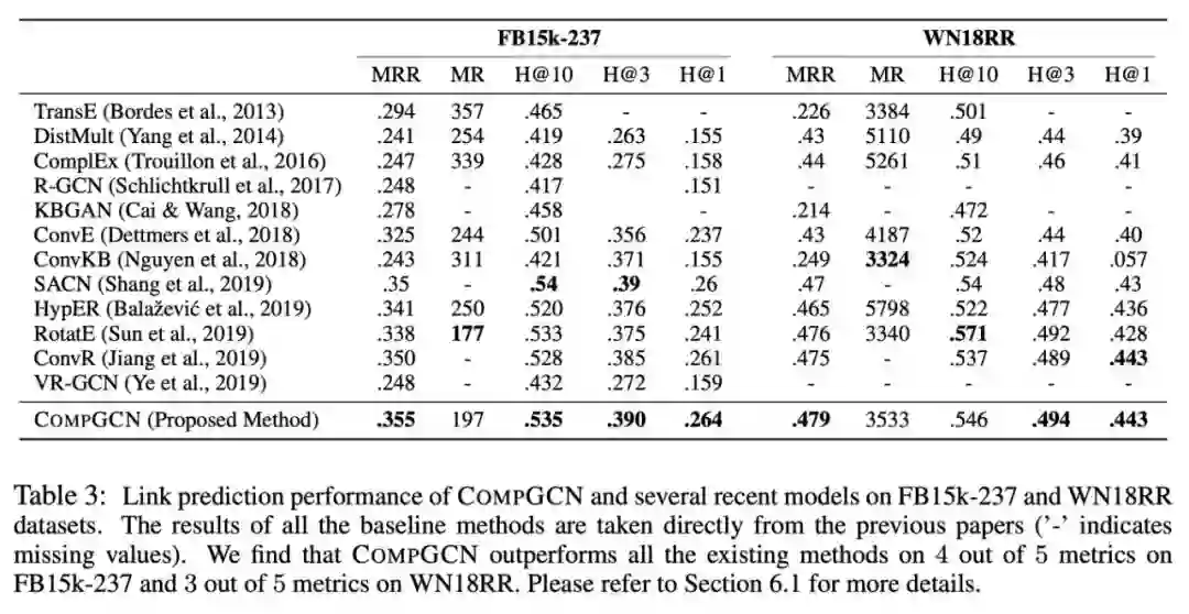 在链路预测任务上(⻅Table 3),CompGCN 在大部分情况下取得了最优的效果。