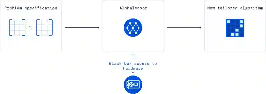 AlphaTensor 具有一个对应于算法运行时的目标。当发现正确的矩阵乘法算法时,它会在指定硬件上进行基准测试,然后反馈给 AlphaTensor,以便在指定硬件上学习更高效的算法。