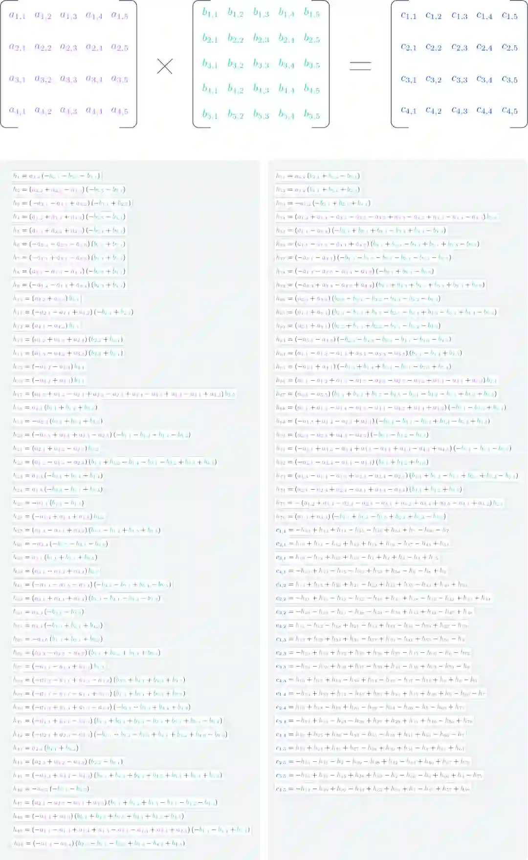 通过研究非常小的矩阵(大小为 2x2),Strassen 发现了一种巧妙的方法来组合矩阵的项以产生更快的算法。之后数十年,研究者都在研究更大的矩阵,甚至找到 3x3 矩阵相乘的高效方法,都还没有解决。