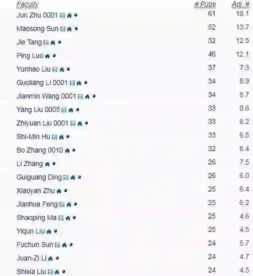在论文作者中,论文数量排名靠前的清华学者如下: