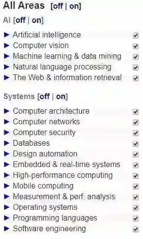 CSRankings.org 的计算机科学高校排名依据的是院校2006-2018年间,在计算机科学各领域较高级会议发表的论文数量。它将计算机科学分为了 4 个门类:AI(人工智能)、Systems(系统)、Theory(理论)、Interdisciplinary Areas(跨学科领域)。在 AI 这一门类下,又分为5个方向:人工智能、计算机视觉、机器学习和数据挖掘、自然语言处理、网页和信息提取。