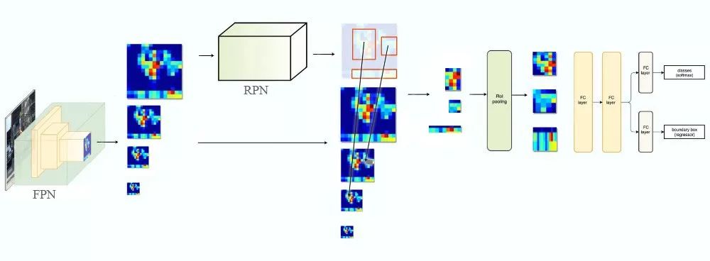 所以,如果k = 3,我们将选择P3作为特征映射,应用ROI池化,并将结果传给Fast R-CNN/Faster R-CNN头(两者的头一致),以完成预测。