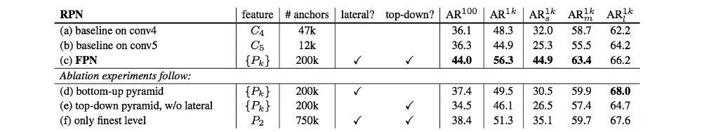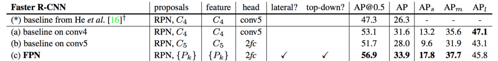 FPN搭配RPN,提升AR(average recall,平均召回)至56.3,相比RPN基线提升了8. 在小目标上的提升更是达到了12.9.