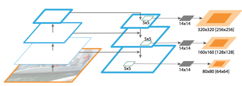 类似Mask R-CNN,FPN也是一个优良的图像分割提取掩码。下图中,应用5x5的滑窗于特征映射,以生成14x14分割。之后,合并不同尺度的掩码以形成最终的掩码预测。