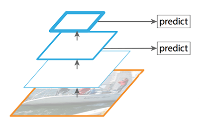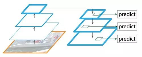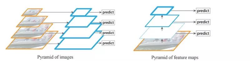 检测不同尺度的目标(尤其是其中的小目标)很有挑战性。我们可以使用同一图像的不同尺度版本来检测目标(下图左部)。然而,处理多尺度图像很费时,内存需求过高,难以同时进行端到端训练。因此,我们可能只在推理阶段使用这种方法,以尽可能提高精确度,特别是在竞赛之类不顾及速度的场景中。我们也可以创建特征金字塔来检测目标(下图右部)。然而接近图像的、由低层结构组成的特征映射在精确目标预测上效果不佳。