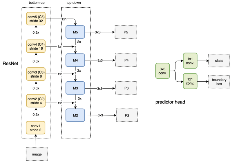 上图中,FPN使用一个1x1的卷积过滤器将C5(最上面的卷积模块)的频道深度降至256维,得到M5。接着应用一个3x3的卷积得到P5,P5正是用于目标预测的第一个特征映射。