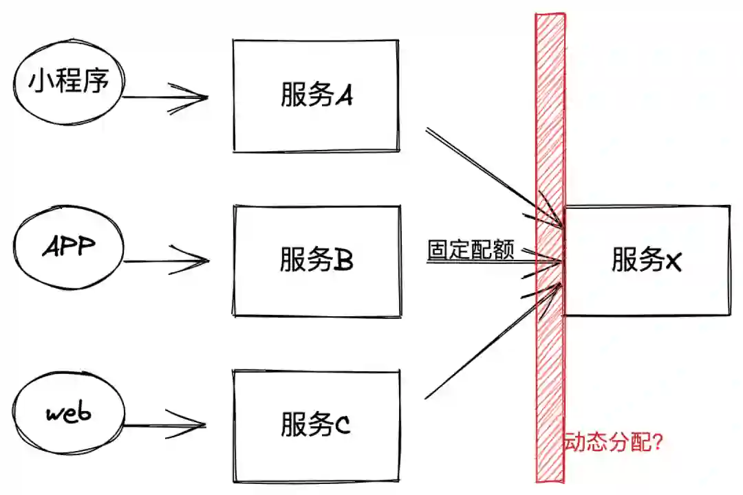 接着我来介绍一下限流里面我们做的一些工作,这里面我们做的模式我把它叫做动态限流。普通的一个限流里面,通常来说是这样的一个方式,我们有 A、B、C 的服务都对 X 这个服务进行了调用,它的来源可能是不一样的,X 为了保护自身的状态是可用的,它不可避免就要对上游 A、B、C 的这些访问分配固定的一些配额,谁超过了配额就不可用了。