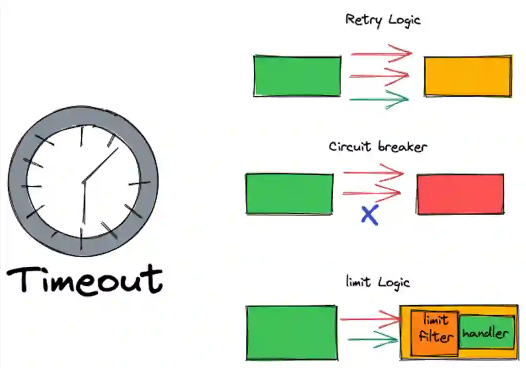 不可避免地,第一,我们一定要设置超时;第二,要在一些场景里面去考虑重试的逻辑;第三,考虑熔断的逻辑,不要被下游拖死;第四,一定要有限流的逻辑,不要被上游打死。
