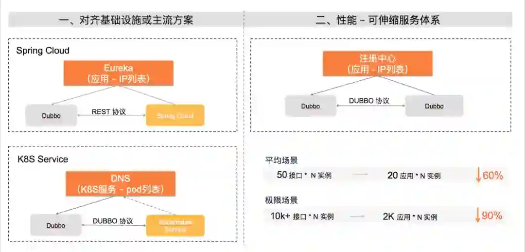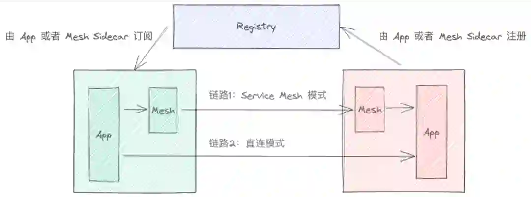 ServiceMesh 里面我主要介绍一下几个关键点:第一个就是注册模型,因为它是一个多协议、多语言的方式,其实比如 Dubbo 或者 HTTP,它在服务层面其实是不统一的,在注册中心我们想要以一个统一的注册中心去服务发现的时候,不可避免地就需要把它的维度统一掉,我们是怎么做到的呢?我们其实是参考了业界现在比较火的,或者基本上应该是事实上的标准,通过服务 - 实例这样的维度去抹除掉了类似 RPC 这种 Dubbo,这种接口的维度,与原来的注册中心去进行双写,来保证 Mesh 化的和非 Mesh 化的都能支持。