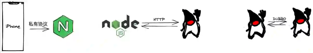 第三个主要提一下协议这部分,我们在公司里面主要有三种协议。第一种私有协议,主要负责 App 和外网网关之间的通信协议;第二个 HTTP 协议,主要是外网网关到 Node、Node 到 Java 之间,甚至有一些 Java 到 Java 之间也会有自己使用的这种 HTTP 协议,不过这种量其实是比较少的;第三个 Dubbo 协议,后端的 Java 服务之间的通信基本上都是用 Dubbo 为主,只有少量的使用 HTTP。