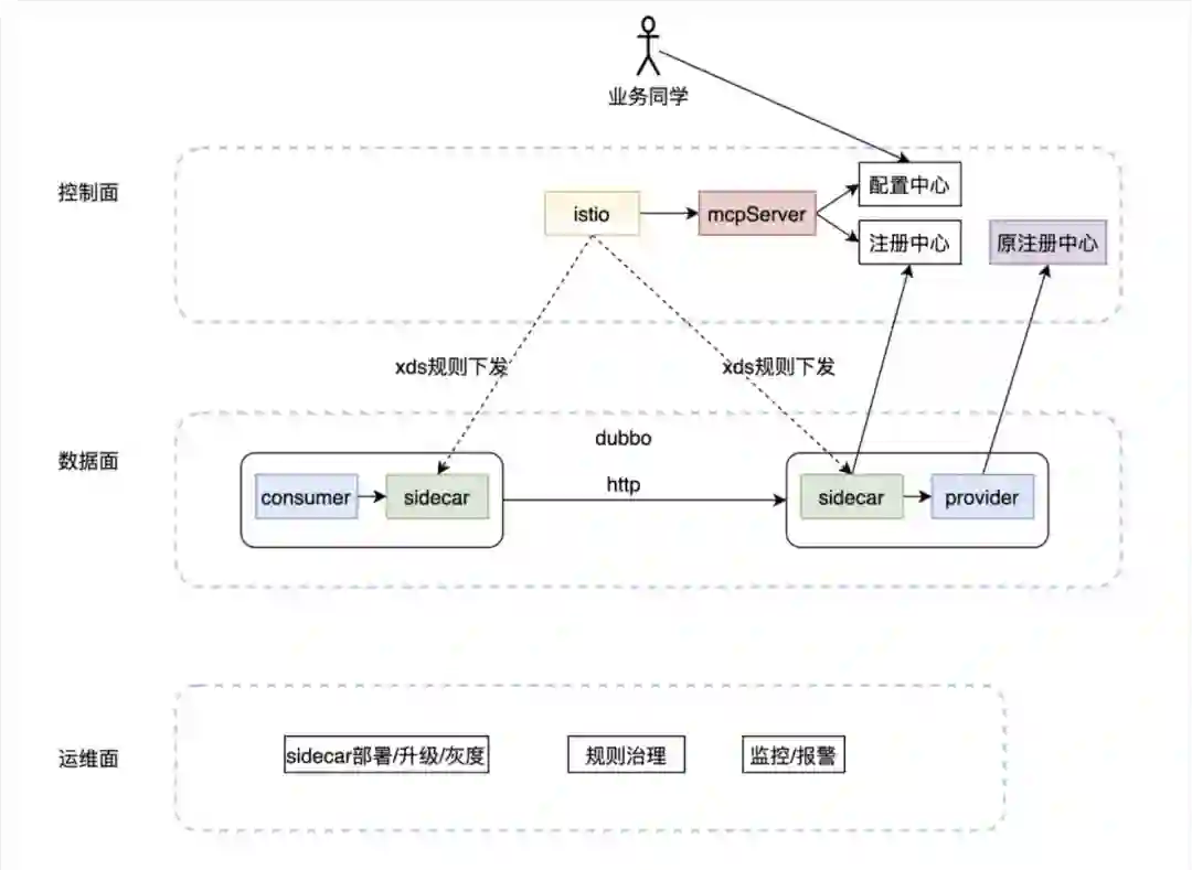 我们最终的选择是,数据面上我们选择了 MOSN,而不是 envoy,MOSN 是基于 Go 开发的一个阿里巴巴官方出品的组件,这个组件其实是一个偏网关代理型的一个组件,但是在上面去实现 Mesh 的逻辑,其实是比较方便的,特别是针对基于 Dubbo 这个协议的 Mesh,MOSN 支持得是比较好的;在控制面上,我们也是基于 Istio 去做了二次开发,也有一定的自研组件,比如说 mcpServer、配置中心、注册中心这些都是我们自研的。在运维面的话,我们也是自研了一套运维相关的组件,比如 Sidecar 的部署、灰度的升级等等,还有一些规则治理、监控报警等。