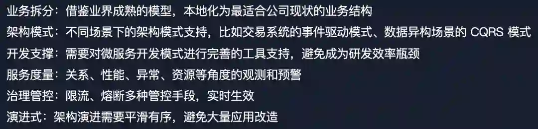 在服务度量里面,我们关系、性能、异常、资源,还有刚才提到的防腐都需要比较有效。第五个就是治理的管控,限流、熔断这种方式需要实时生效,最好是把它统一化而且进行业务有效化。最后一个就是演进式,架构的演进需要平滑有序,避免大量的应用改造。