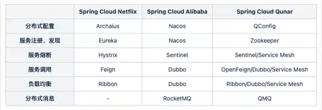 对应地可以看到 Spring Cloud Alibaba 也有自己的实现,像 Nacos、Sentinel、Dubbo、RocketMQ 等等。我们其实就在思考着去哪儿网自己有这么多自研的组件,是否能够适配 Spring Cloud 这样的一套标准,进而去达到开发提效、互相串通组件的目的?