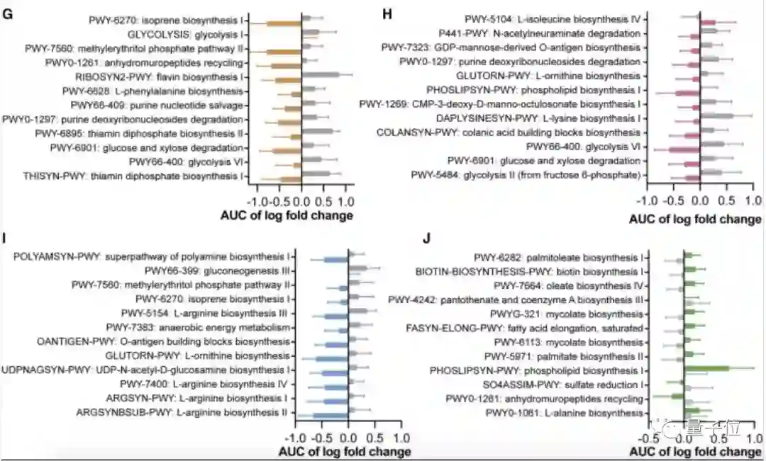 其中,三氯蔗糖组微生物变化明显影响了嘌呤代谢;而糖精组的糖酵解和葡萄糖降解途径,阿斯巴甜组的多胺类代谢,甜叶菊组的脂肪酸合成也分别受到严重影响。